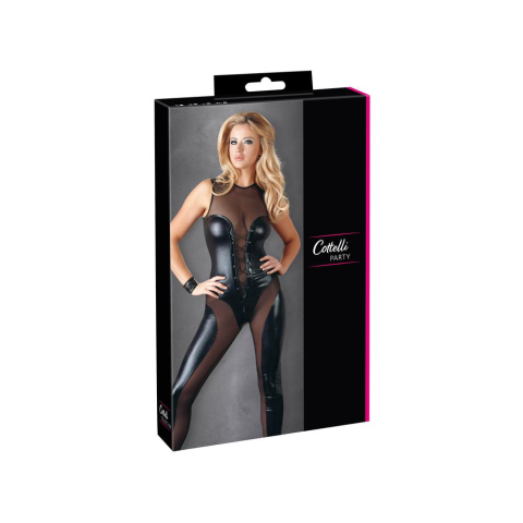 Ez a csábító fekete overall átlátszó anyagból és fényes wet-look részletekből készült, amitől a megjelenése egyedülálló és szexi lesz.