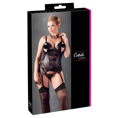 Fedezd fel az érzékiség és stílus tökéletes kombinációját ezzel a szexi harisnyatartós felsővel, amely fényes nedves hatású anyagával és finom csipke berakásaival garantáltan lenyűgöz! Miért jó? Elegáns dizájn: Az elöl fényesen csillogó, selymes nedves h