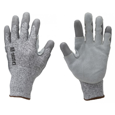 Termékleírás: - 13-as kötésű, HDPE / poliészter kesztyű - tenyerén és az ujjakon szürke PU bevonat és bőr megerősítés, a hüvelykujj és a mutatóujj kivételével - para-aramid varrás és kötött mandzsetta - érintőképernyő használhatósága a mutatóujj és hüvely