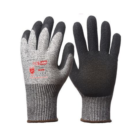 VÁGÁSBIZTOS SZERELŐKESZTYŰ, EUROCUT 5 L580 (1CRHB) - 13-as kötésű, legmagasabb színtű szakítás- és kopásállóságú - szúrásbiztos illetve maximális 5-ös szinten vágásbiztos HPPE (high performance PE) - üvegszál alapanyagú védőkesztyű - tenyerén fekete