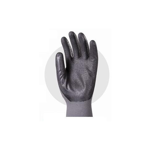 Tenyéren nitrillel mártott PU védőkesztyű 6316-20-as Cikkszám: 6316-20 - 13-as kötéű, nagy szakítószilárdságú szürke, nylon alapkesztyű - tenyéren fekete mikro-habosított finom nitril mártás, csúszás ellen érdesítve - gumírozott, rugalmas mandzsetta