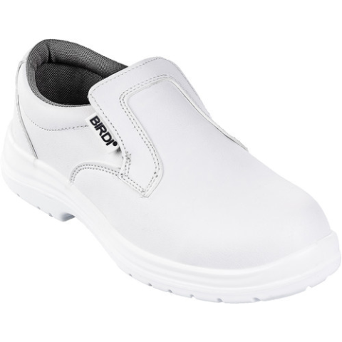 BIRDI (O2) FEHÉR CIPŐ • bebújós félcipő acél lábujjvédővel • folyadékoknak jobban ellenálló, fehér mikroszálas felsőrész • kiváló szellőző, vízgőzáteresztő tulajdonságok • antisztatikus, olajálló, hajlékony, kétrétegű, fehér PU talp, ütődéselnyelő sarokka