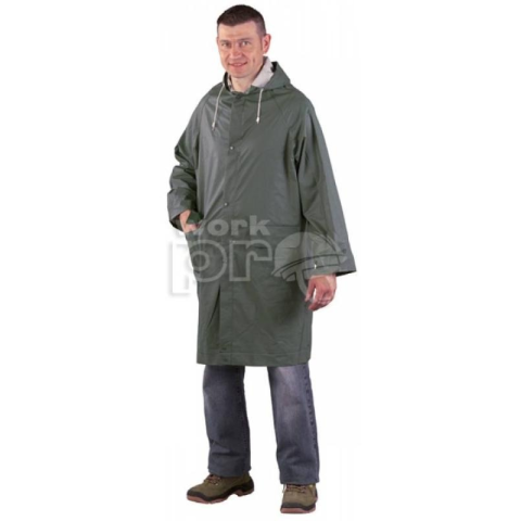 ZÖLD PVC ESOKÖPENY:poliészter/pamut alapra kétszer mártott PVC0,32 mm vastag, varrott és hegesztett, vízállócipzáras és patentos záródászsinórral állítható bőségű kapucnikét külső zseb, gumírozott mandzsettarövid, 3/4-es (100 cm) köpeny kivitelszín: zöldméret: LEU szabvány: EN340, EN343 Cl. 1.