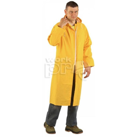 PVC SÁRGA ESOKÖPENY, 120 CM:poliészter/pamut alapra kétszer mártott PVC0,32 mm vastag, varrott és hegesztett, vízállócipzáras és patentos záródászsinórral állítható bőségű kapucnikét külső zseb, gumírozott mandzsettahosszú, 4/4-es (120 cm) köpeny kivitelszín: sárgaméret: MEU szabvány: EN340, EN343 Cl. 1.