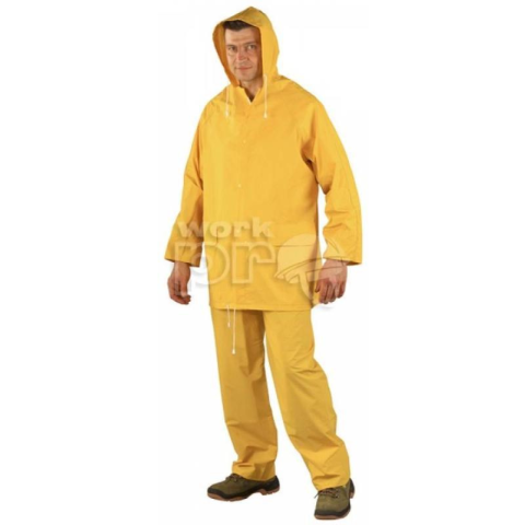 PVC SÁRGA ESORUHA:poliészter/pamut alapra kétszer mártott PVC0,32 mm vastag, varrott és hegesztett, vízállócipzáras és patentos záródászsinórral állítható bőségű kapucnikét külső zseb, gumírozott mandzsettasav- és lúgálló kétrészes ruha kivitelszín: sárgaméret: MEU szabvány: EN340