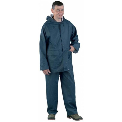 PU/PVC KÉK ESORUHÁZAT:erős, 300 g/m? poliészterre mártott speciális PU/PVC mixrendkívül könnyű, nagy szakítószilárdságú, kényelmes viseletű anyagteljesen vízhatlan, varrott plusz hegesztett illesztésekKÉTRÉSZES RUHA (kabát+deréknadrág): kapucnis, cipzáros+patentos kabát, két zsebbelgumírozott deréknadrág, szűkíthető bokarésszelszín: kékméret: LEU szabvány: EN340, EN343 Cl. 1.1