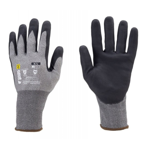 EUROCUT N303 MIKROHABOS, 18G VÁGÁSBIZTOS KESZTYŰ maximális szakítás- és kopásállóságú, C szinten TDM vágásbiztosságú, 18-as kötésű, vékony multiszálas (HDPE, poliészter és spandex alapanyagú) szürke fogásbiztos védőkesztyű tenyerén csúszásbiztos fe