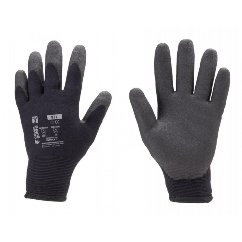 EUROICE 2 BÉLELT TÉLI VÉDŐKESZTYŰ HABOSÍTOTT PVC HPT MÁRTÁSSAL_x000D_ _x000D_ _x000D_ bélelt szerelőkesztyű, hideg-, nedvesség- és mechanikai ártalmak ellen_x000D_ 15-ös kötésű, kopásálló fekete poliamid alap_x000D_ tenyéren fekete habosított, csúszás