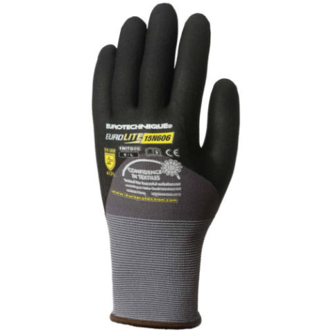 EUROLITE • 15-ös kötésű, erős szakítás- és kopásállóságú szürke nylon / spandex • ökölcsontig fekete szellőző mikrohabosított nitrillel mártott • szellőző kézhát, gumírozott mandzsetta • könnyű, kiemelten komfortos, teljesen kézre simuló formai kialakítás
