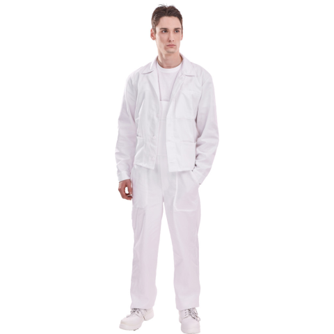 FEHÉR TEXTIL KABÁT: • fehér színű, 230 g/m² vastag, kiválóan szellőző, testbarát 100% pamut alapanyag, mely 90°C-on is mosható • KABÁT: egyenes fazonú, cipzáros felső, gumibetétes derékkal, két bebújós, két rátétes zsebbel és tolltartókkal • méret: 50 • E