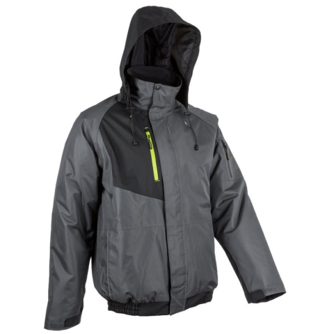 Coverguard munkaruha GOMA RIPSTOP TÉLI SOKZSEBES DZSEKI szürke/fekete Cikkszám: 5GOM450 Fényvisszaverő csík Levehető vagy elrejthető kapucni Sokzsebes ruházat Állítható mandzsetta Gumibetétes alsórész RIPSTOP (5mm) : 300g/m², PVC-vel borított 10