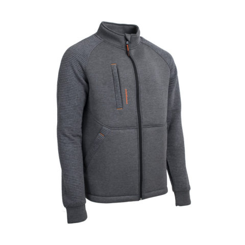 Szürke thermo dzseki; 3D kétoldalas anyag: 78% poliészter / 16% viszkóz / 6% elasztán - 320 g/m2 vastag; álló gallér; állvédő; cipzáras záródás; hullámos díszítés az ujjakon; mandzsetta betétek; 1 cipzáras felső zseb; 2 paszpólos cipzáras oldalzseb.