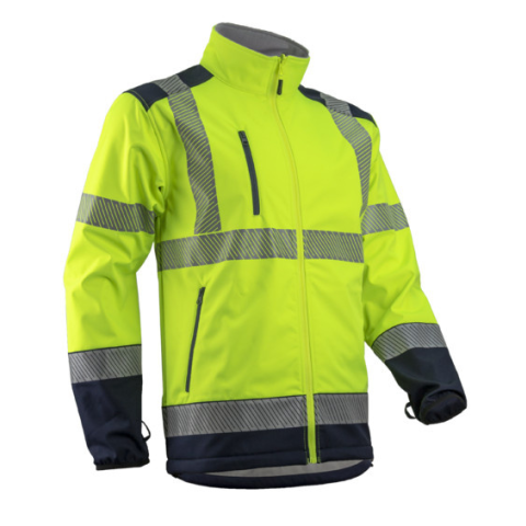 * 300 g/m2 vastag 3 rétegű Softshell alapanyag: 100% poliészter + TPU membrán + 100% poliészter mikropolár * szegmentált fényvisszaverő csíkok: 5 cm széles * az alapanyag vízállósága: 3000 mm , páraáteresztő képessége: 800 g/m2/ 24h * koszolódás mente