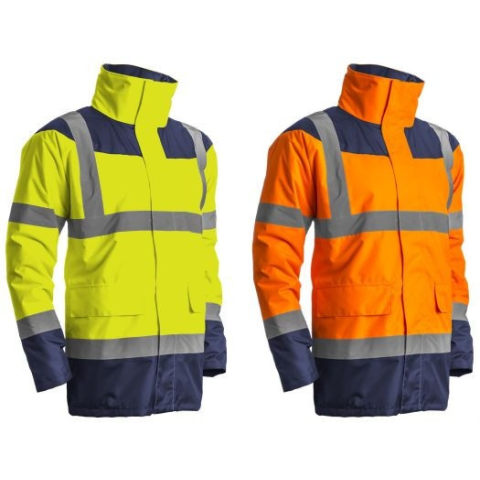 KETA JÓLLÁTHATÓSÁGI VÉDŐKABÁT PU-val vízhatlanított fluoreszcens Oxford 300D poliészter külső, taft belső 140 g/m2 hőszigetelő poliészter bélés rejtett kapucni illetve kétkocsis cipzár tépőzáras fedéssel végig az álló gallérig hegesztett, vízhatl