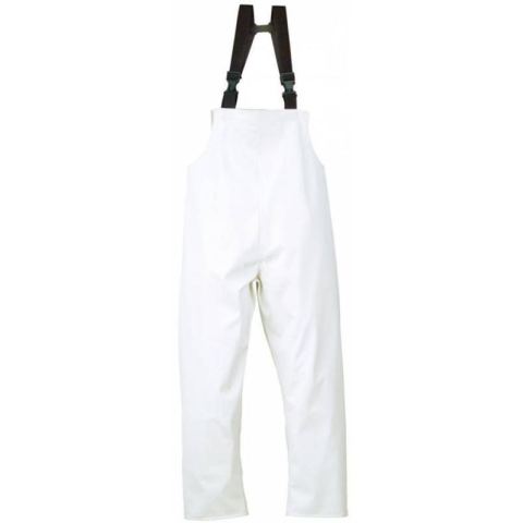 FOOD FEHÉR ÉLELMISZERIPARI MELLESNADRÁG:fehér színű, 210 g/m? vastag, 40% poliuretán és 60% poliészter összetételű alapanyaghegesztéssel vízhatlanított varráskönnyű, de erős, jó hőszigetelő védőruházat, mely eltérő hőmérsékleti körülmények között is változatlan komfortot biztosítellenáll élelmiszeripari vegyszereknekMellesnadrág (8FOOB): rugalmas, állítható vállpánt műanyag csatokkalzseb a mellrészenpatentos bokarészméret: SEU szabvány: EN340