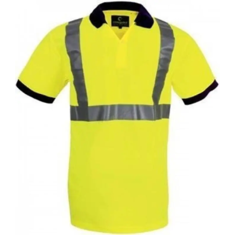 YARD FLUO TENISZPÓLÓ, SÁRGA:jó láthatóságú sárga színű teniszpóló100% poliészter, 140 g/m? vastag, fluoreszcens, szellőző piké alapanyag5 cm széles fényvisszaverő csíkokegyenes vonalú szabássötétkék, gombos nyakú, 100% pamut gallér és ujjvégekméret: LEU szabvány: EN340, EN ISO 20471 (Cl 2)