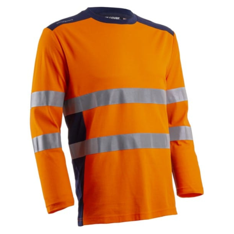 Bird-eye kötés: 55% pamut / 45% poliészter – 150g/ m2 5 cm széles fényvisszaverő csíkok – varrott és mikrogyöngyös technológia - 2 – 2 a testen és a karokon A pamut réteg érintkezik a bőrrel Környakas kialakítás, hosszú ujjú fazon Kontraszt színű beté