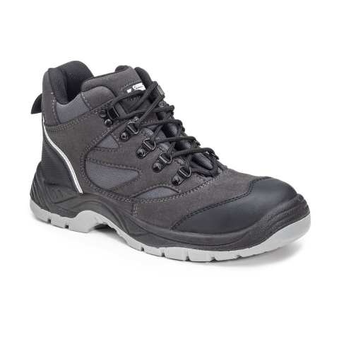 Biztonsági munkavédelmi bakancs fekete velúr bőrből, szellőző és víztaszító antracit szürke hálós betétekkel. A bakancson plusz orr- és sarokborítás található, továbbá fényvisszaverő díszcsík a lábbeli hátsó részén. Védelem S3-as védelmi szint, amely