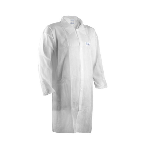 SPP POLYPRO FEHÉR KÖPENY ZSEB NÉLKÜL LEÍRÁS : SPP polipropilén alapanyagú fehér köpeny 4 patenttal záródó köpeny, gumírozott mandzsettával és klasszikus gallérral 42 g/m2 vastag, zsebek nélkül 110 cm hosszó ELŐNYÖK : könnyű* patentos zseb nélk
