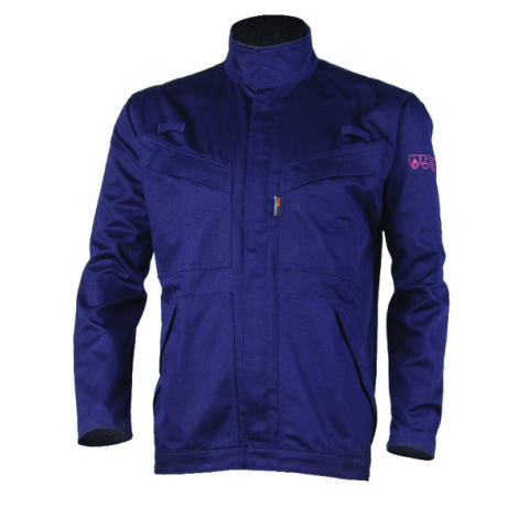 * 350 g/m2 vastag, 98% pamut + 2% antisztatikus alapanyagú sötétkék, láng-, és íválló, antisztatikus hegesztő védőkabát * rejtett patenttal záródó állógallér, fedett cipzár, patenttal állítható derékrész * hosszú ujjú, patenttal állítható csuklóbőség, sza