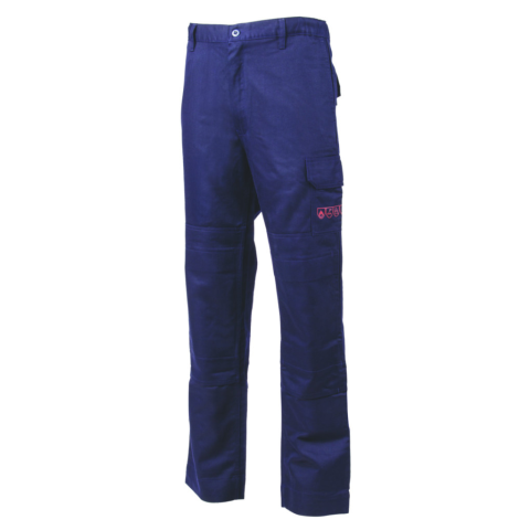 * 350 g/m2 vastag, 98% pamut + 2% antisztatikus alapanyagú sötétkék, láng-, és íválló, antisztatikus hegesztő védőnadrág * cipzáras záródás, gumis derékrész övbújtatókkal, alul nyitott térdvédő zsebek * bokánál 5 cm-es lehajtható szegés, szabványok piktog