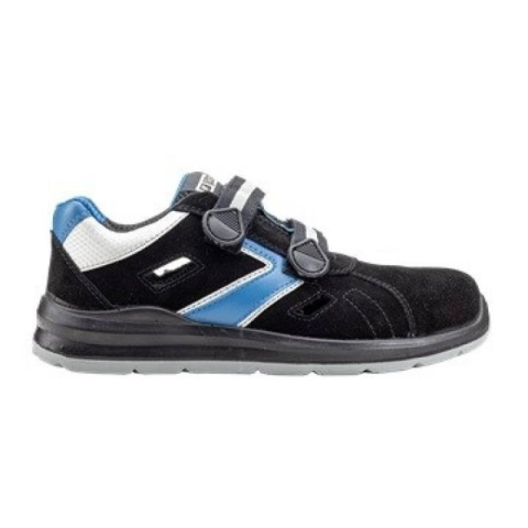 biztonsági védőszandál puha, szellőző velúrbőr felsőrésszel és hálós betétekkel fekete és kék/fehér színbenantisztatikus, olajálló, hajlékony kétrétegű PU talp SRC csúszásmentességgelkényelmes és könnyű kompozit lábujjvédő leeső tárgyak ellenfémmentes textil átszúrás mentes talplemezszivaccsal párnázott boka, szellőző 3D hálós belső bélésszéles és masszív tépőzárak műanyag megerősítésselütődéselnyelő sarok, kényelmes talpbetét, kom