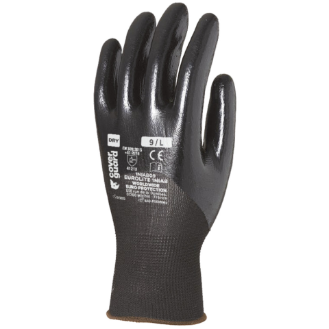 FEKETE ÖKÖLCSONTIG NITRIL MÁRTOTT SZERELŐKESZTYŰ: • fekete, kiválóan kézre illeszkedő, 13-as kötésű, poliészter alapkesztyű • tenyerén és a kézháton ökölcsontig fekete nitrillel mártott • gumírozott, rugalmas mandzsetta, szellőző kézhát • méret: 10-es • c