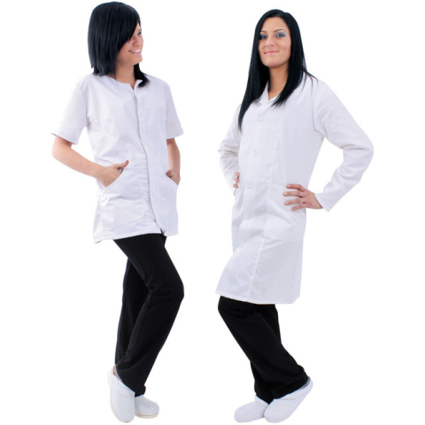 * 245 g/m2 vastag, lánckötésű, 65% poliészter, 35% pamut alapanyag * karcsúsított fazon, két oldalzseb * rövid ujjú, gallér nélküli, cipzáras, jól szellőző köpeny, tartós vászonból * szín: fehér * karcsúsított fazon, *jól szellőző köpeny, tart