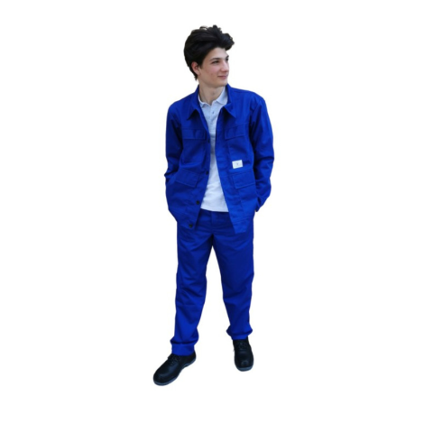* királykék derekas öltöny, 245 g/m2 kopásálló, sávoly kötésű, 65% poliészter, 35% pamut alapanyag * folyadéklepergető védőruházat, korlátozott védelmet nyújt kisnyomású vagy fröccsenő, folyékony vegyszerek ellen (pl. kénsav, lúg, o-Xilol és butanol) – 6.