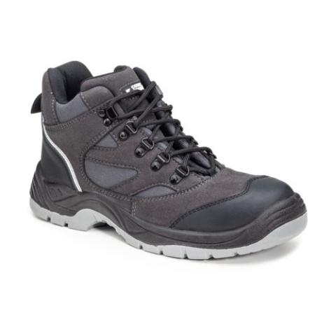 • biztonsági védőlábbeli fekete velúr bőrből, szellőző és vízálló antracit szürke hálós betétekkel • plusz orr- és sarokborítás, fényvisszaverő díszcsík a lábbeli hátsó részén • acél lábujjvédő leeső tárgyak- és acél talplemez talpátszúrás ellen • antiszt