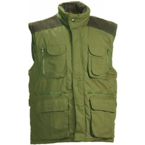 BRESSAN VADÁSZMELLÉNY:zöld vadászmellény35% pamut, 65% poliészter anyagvelúr/kord vállbetét és gallér180 g/m? poliészter bélés, kényelmes poliamid belsőhárom bebújós, négy tépőzáras és négy cipzáros zsebállítható derék- és aljrészméret: SEU szabvány: EN340