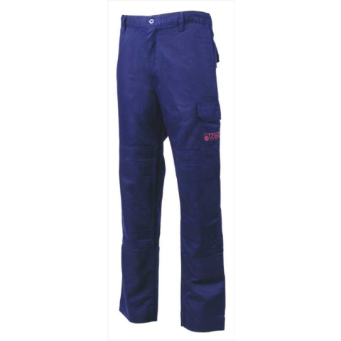 350 g/m2 vastag, 98% pamut + 2% antisztatikus alapanyagú sötétkék, láng-, és íválló, antisztatikus hegesztő védőnadrág * cipzáras záródás, gumis derékrész övbújtatókkal, alul nyitott térdvédő zsebek * bokánál 5 cm-es lehajtható szegés, szabványok piktogramjai a combzseb ráhajtásán * 2 fedett farzseb, 2 oldalzseb, 1 fedett combzseb patenttal, 1 fedett szerszámzsebSzín : TengerészkékElőnyök : * opcionális térdvédő * íválló és antisztatikus *