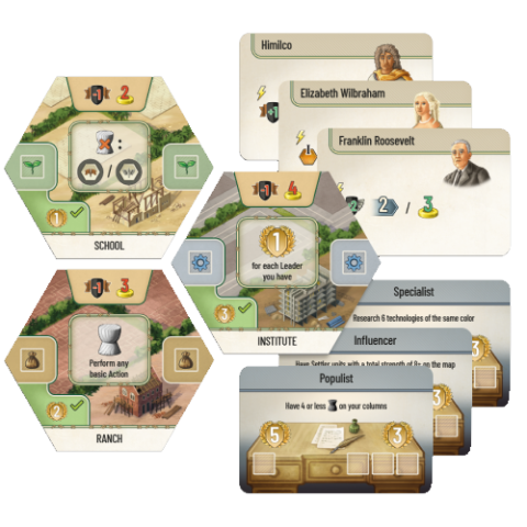 Mechanizmusok: terület többség szerzés, térkép bővítés, tulajdonlás, pontról pontra mozgás, fejlesztések, lapka lehelyezés, munkás lehelyezés