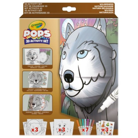 Emeljük 2D-rõl 3D-re a színezést!A Crayola POPs vadon tematikájú 3D foglalkoztató csomagja egy modern, innovatív technikával ismerteti meg az alkotni vágyó gyerekeket, amellyel egyszerűen háromdimenziós képeket készíthetnek. A lurkóknak nincs más dolguk, mint kiszínezni a kiváló minőségű filctollakkal a dobozban található 3 háttér egyikét, valamint a 3D-s hatáshoz szükséges lapot. Ezután "ki kell pattintaniuk" a 3D-s lap egyes részeit, majd az utasításoknak m