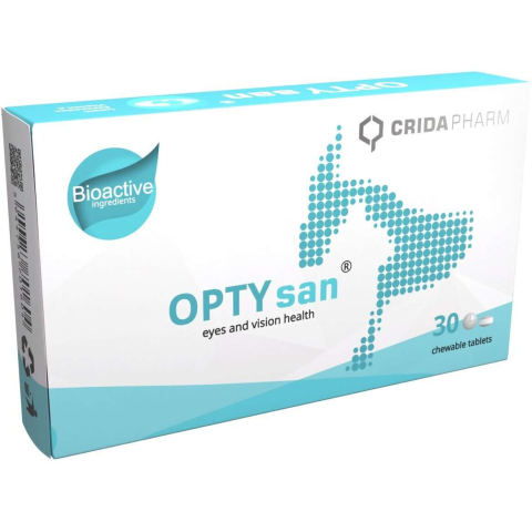 A Crida Pharm OPTYsan rágótabletta egy kutyák és macskák számára kialakított, gyógynövénykivonatokkal dúsított, sokoldalú takarmánykiegészítő a szem egészségének támogatására. A luteint, zeaxantint, A-vitamint és természetes kivonatokat tartalmazó komplex formula támogatja a szem egészségét: védelmet nyújt az UVA/UVB sugárzás ellen, illetve csökkenti a retinakárosodás kockázatát és intenzitását. Fehér szőrű kutyáknak különösen ajánlott, mert ös