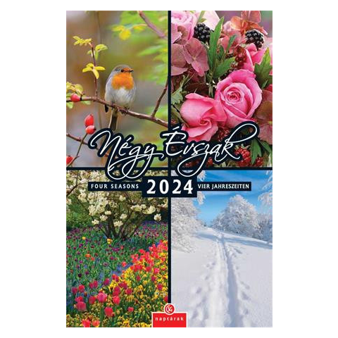Naptár, fali, CSG, Négy évszak -méret: 210x320 mm -tartalom: 6 lap + boritó + hátkarton -kivitel: 115 g műnyomó papírból 4 színnyomással -spirálozott, egyenként fólia tasakban -naptár rész: magyar, angol, német nyelven, magyar ünnepek és névnapok