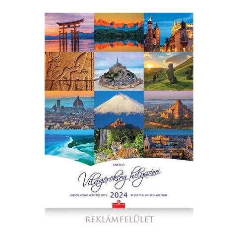 Naptár, fali, CSG Világörökség helyszínei -méret: 400x580 mm + 40 mm -tartalom: 13 lap + boritó + hátkarton -lap típusa 135 g, műnyomó papírból, 4 színnyomással -szélesen sapkázott, egyenként fólia tasakban -naptár rész: magyar, angol, német nyelve