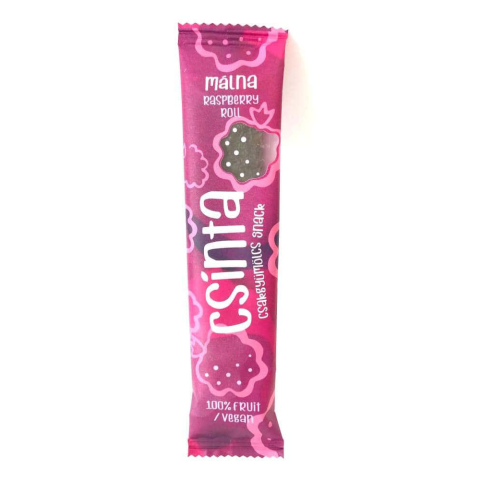 Csinta gyümölcstekercs málna 12 g Szárított málnás gyümölcstekercs. Összetevők: Málna, alma és semmi más. Száraz hűvös helyen, zárt csomagolásban tartva finom marad.
