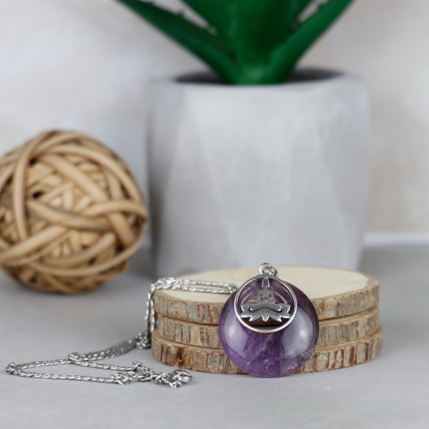 Ametiszt fánk medál, buddhával. Medál 3cm. A fém rész antiallergén bevonattal készült. Ametiszt: Javítja a memóriát, fokozza az önállóságot, javítja az önbecsülést, növeli a szeretet képességét. Az ametiszt védelmező kő Csakra: Koronacsakra Csillagjegyei: