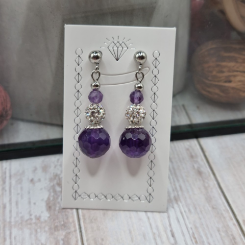 Ametiszt strasszos fülbevaló. Az ásványok fazettált 4 és 10mm-es ametiszt golyók, közte 6mm-es strasszos golyóval. Nagyon szépen csillog A fémek antiallergén bevonattal készültek, a bedugós rész nemesacél. Méret 3,5cm Ametiszt: 8mm-es ásványból készül