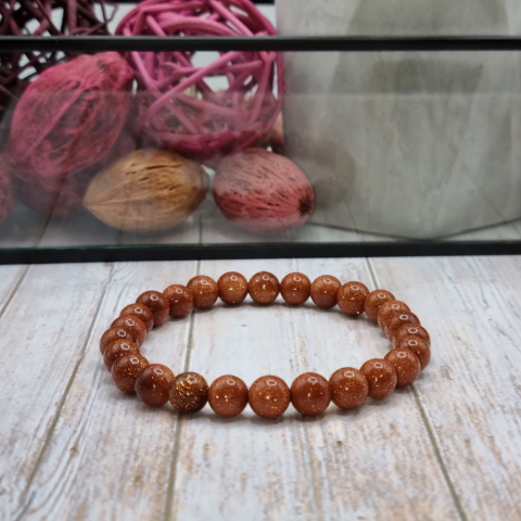 A karkötőn lévő gyöngyök, valódi ásványok rugalmas szilikonra vannak fűzve, több méretben rendelhető Aranykő karkötő 8mm-es gyöngyökből készül. Barna üvegmasszába rézreszelékeket öntenek így lesz nagyon szép csillogós ékszer belőle.