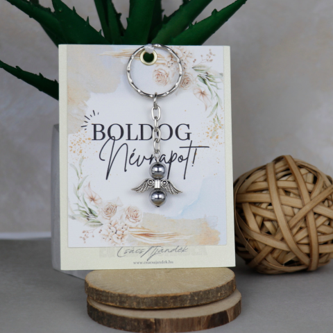 8 mm-es hematit ásványból készült angyalka kulcstartó. Teljes hossz:7cm Választható kísérő kártyával, akár egyedi szöveggel is kérhető. Hematit: Sokan általános erősítőnek tartják ami fokozza a megbízhatóságot és akaraterőt, javítja a memóriát és az össz