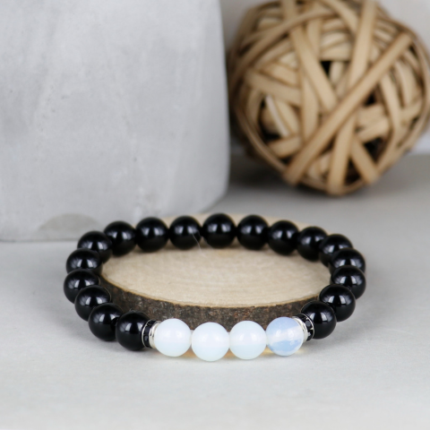 A karkötőn lévő gyöngyök 8mm valódi ásványok, rugalmas szilikonra fűzve, fekete köves köztes dísszel. Több méretben rendelhető. Opál: Magas rezonanciát sugároz, amely serkenti az agyi tevékenységet, így javítja a memorizálást. Csillagjegy: Rák, Szűz, Nyi