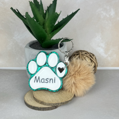 Egyedi csillogó, névre szóló kulcstartó mely bármilyen névvel kérhető. A kulcstartó műgyantából készült, bojttal. (a bojt a színe nem választható, az aktuális készleten lévő bojttal tdjuk küldeni) A csillám színe választható. Mancs magassága 6.5cm