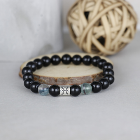 Ónix és fluorit 8mm-es ásványból készült karkötő, a horoszkóphoz tartozó fém jeles köztessel. Halak: február 19. - március 20 Ónix: Az ónixot támogató, erőt adó kőnek tartják. Gyakran ajánlják a negatív érzelmek ( Félelem, indulatosság, szomorúság ) felo