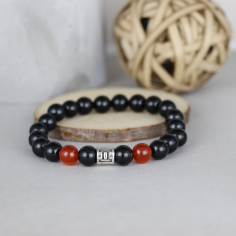 Ónix és karneol 8 mm-es ásványból készült karkötő, a horoszkóphoz tartozó fém jeles köztessel. Ikrek: május 22.–június 21. Ónix: Az ónixot támogató, erőt adó kőnek tartják. Gyakran ajánlják a negatív érzelmek ( Félelem, indulatosság, szomorúság ) feloldá