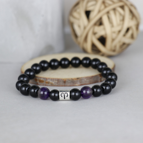 Ónix és ametiszt 8 mm-es ásványból készült karkötő, a horoszkóphoz tartozó fém jeles köztessel. Kos: március 21. - április 20. Ónix: Az ónixot támogató, erőt adó kőnek tartják. Gyakran ajánlják a negatív érzelmek ( Félelem, indulatosság, szomorúság ) fel