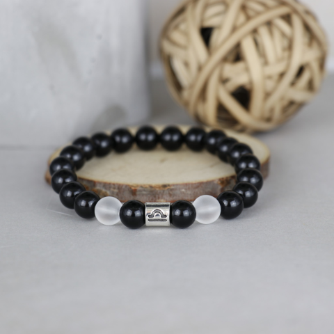 Ónix és matt hegyikristály 8 mm-es ásványból készült karkötő, a horoszkóphoz tartozó fém jeles köztessel. Mérleg: szeptember 23. - október 23. Ónix: Az ónixot támogató, erőt adó kőnek tartják. Gyakran ajánlják a negatív érzelmek ( Félelem, indulatosság,
