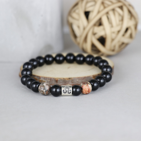 Ónix és leopárd jáspis 8 mm-es ásványból készült karkötő, a horoszkóphoz tartozó fém jeles köztessel. Oroszlán: Július 23. - Augusztus 23. Ónix: Az ónixot támogató, erőt adó kőnek tartják. Gyakran ajánlják a negatív érzelmek ( Félelem, indulatosság, szom