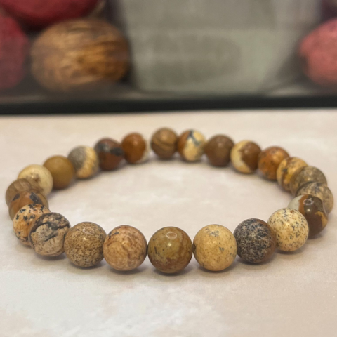 Képjáspis 8mm-es ásványokból készült karkötő, rugalmas szilikonra fűzve. Több méretben rendelhető. A pontos méret kiválasztásához mérd meg pontosan a csuklód. Úgy vélik a bizalmatlanság és a féltékenységet megsegítő kő.